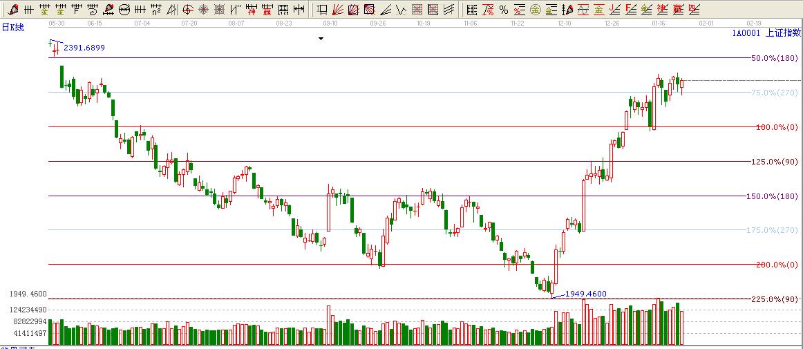 綜上所述:大盤運(yùn)行在波段百分比延伸線270度位置上方,上方壓力180度位置。270度位置不破看高一線。