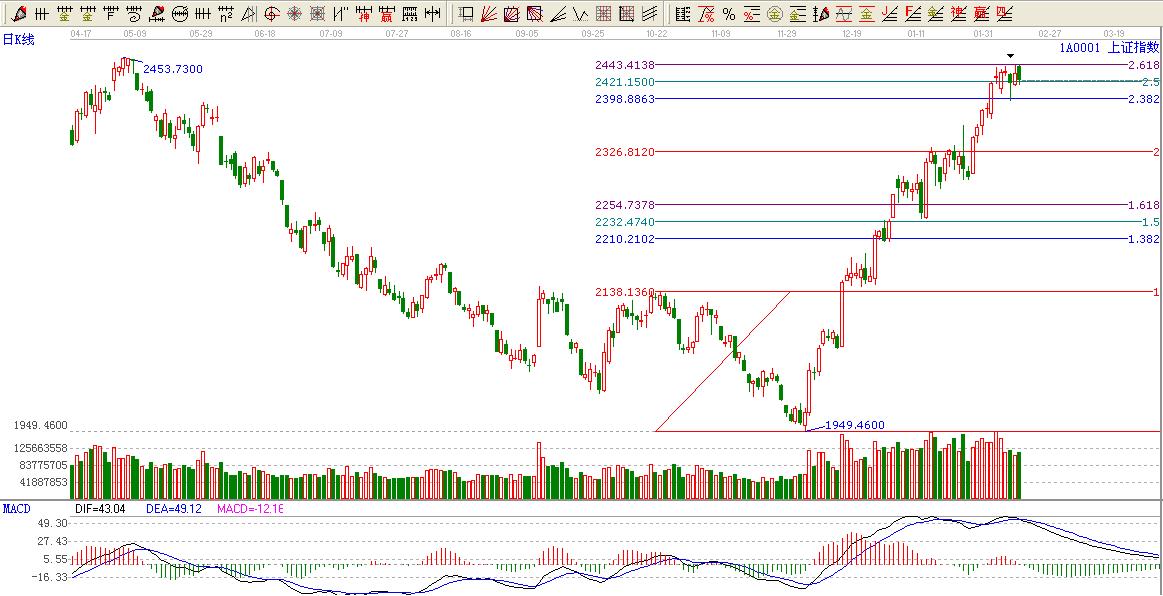 大盤如期圍繞黃金分割2.618-2.382位置震蕩,也再一次滲透了黃金分割在金融市場一個不可忽視的細節問題。盤面大盤高開后震蕩走低,個股較為活躍截止收盤大盤跌10.84點跌幅0.45%,漲停家數29家,跌幅5個點以上的15家。引人注目的就年前復盤的10家st股票4家漲停4家跌停,可謂是雷厲風行。