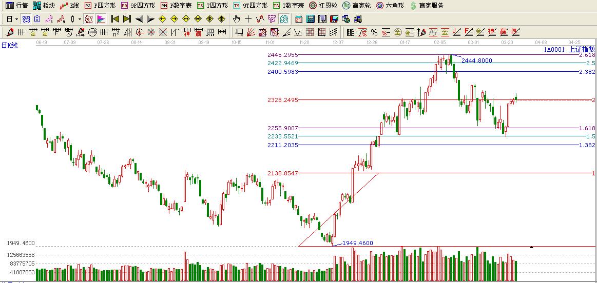 ★依據贏黃金價格延伸線提示:目前大盤出于黃金分割2倍位置2328附近,這里跟極反通道生命線構成了雙重壓力位置。這里不過謹慎大盤再一次回落。