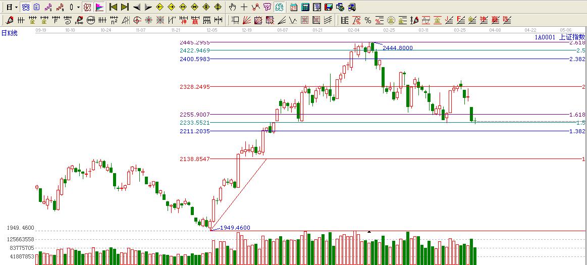 ★依據贏黃金價格延伸線提示:大盤再度考驗黃金分割延伸1.5位置2230附近支撐,一旦破位持續看空至黃金分割延伸線1.382位置2210附近。只有上行在1.618位置才會見2328點附近。