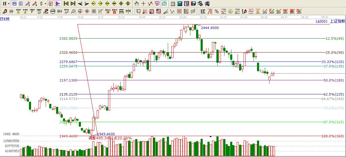 ★依據贏波段百分比提示:大盤1949.46點至2444.80點回調目前處于180度位置2197.13點上方,這里不破看高一線至135度位置2259.04點