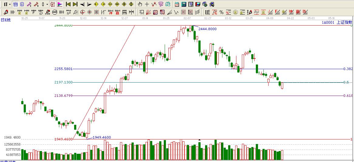 ☆依據黃金價格回調支撐位提示:大盤1949.46點至2444.80點回調目前處于0.5位置2197.13點下方,只有上行至0.5位置上方才會觸摸0.382位置2255.58點。