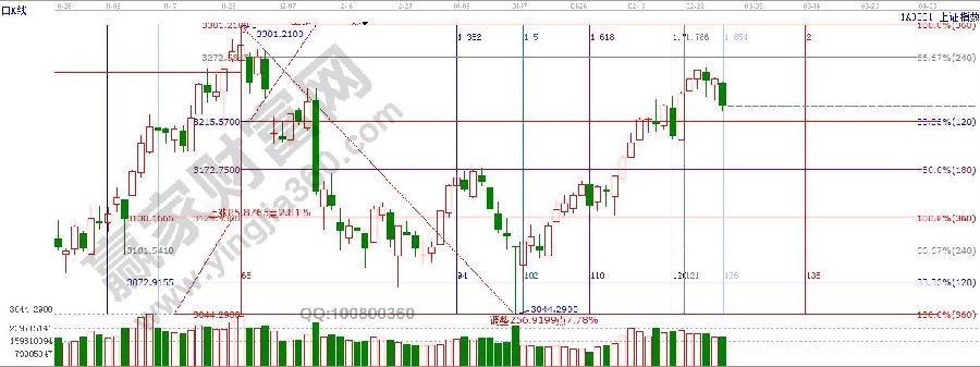 ☆依據(jù)贏家江恩理論系統(tǒng)江恩波段百分比線提示:依據(jù)百分比分析阻力位是3272點附近,阻力位3243點。回落下方支撐短線3222點,日線120度置3215點附近。