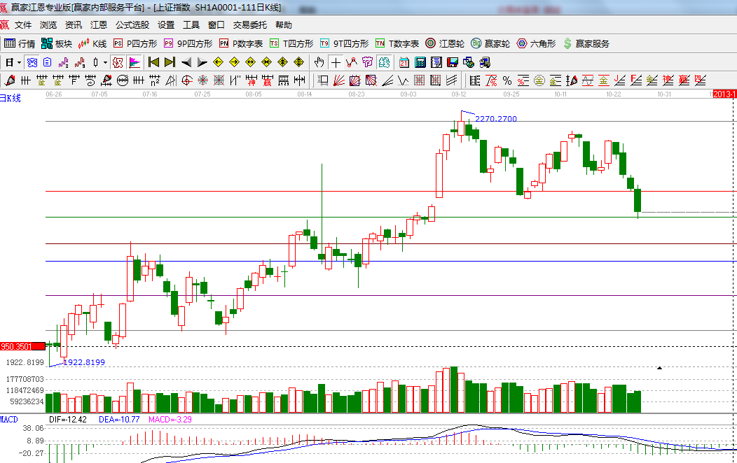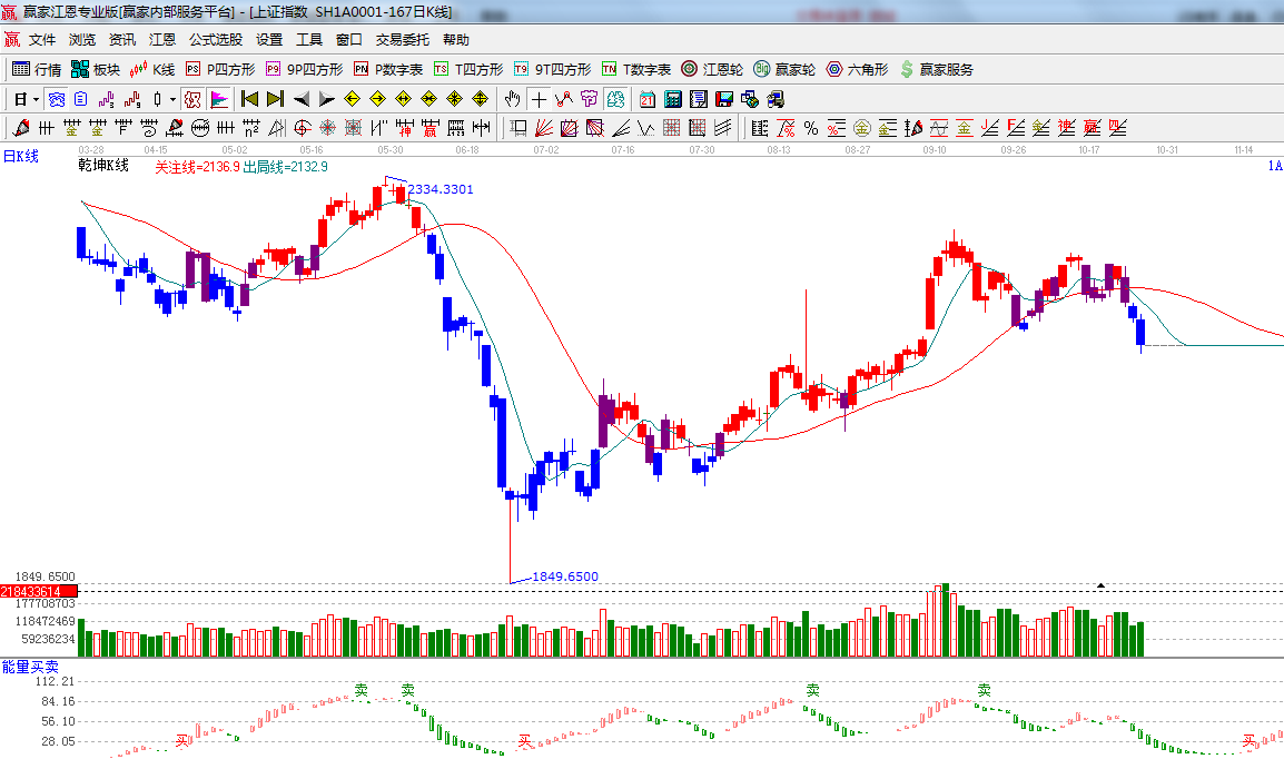 ☆依據贏家江恩系統能量買賣提示:空頭綠色柱子加長,空方占據優勢;