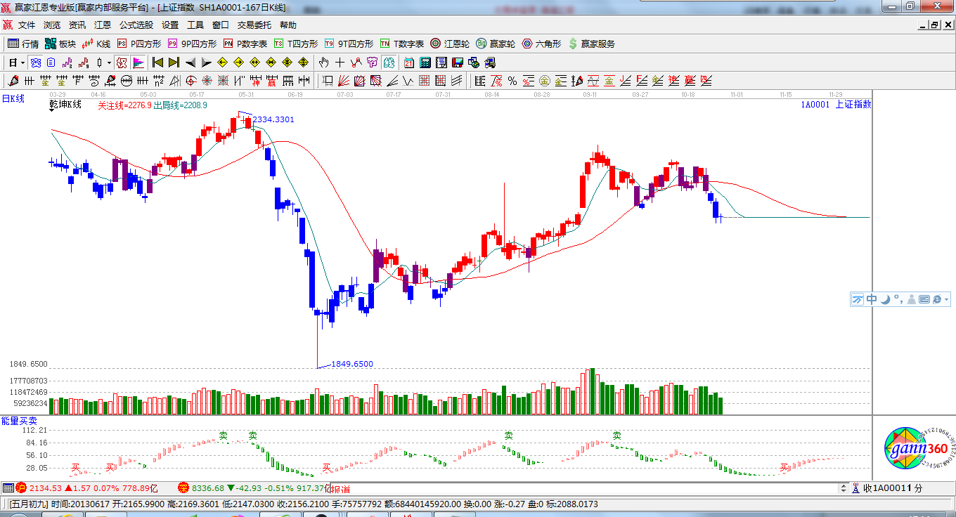 ☆依據贏家江恩系統能量買賣提示:空頭綠色柱子加長,空方占據優勢;