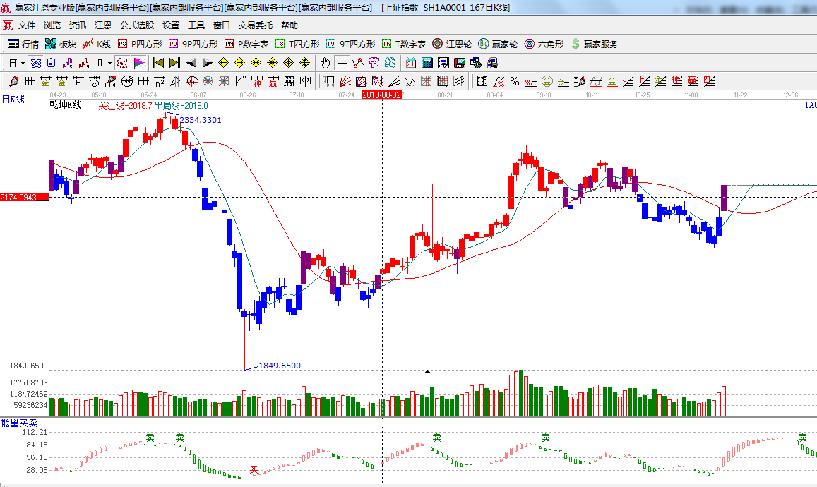 ☆依據(jù)贏家江恩系統(tǒng)能量買賣提示:紅色柱子出現(xiàn),多方占據(jù)主動權看多;