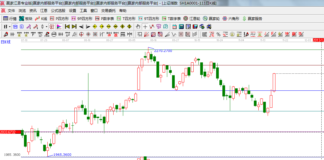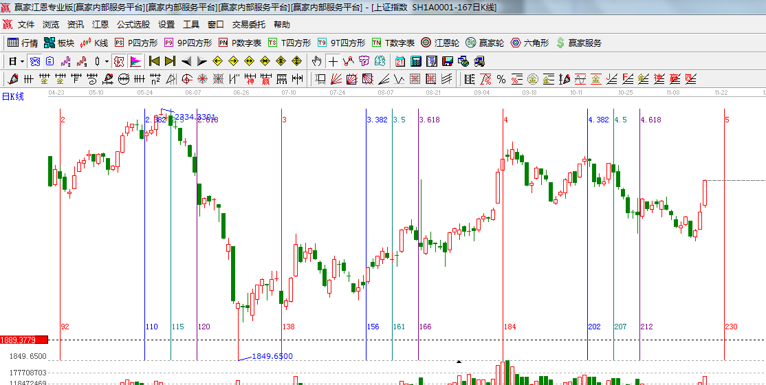 ★依據(jù)贏家江恩系統(tǒng)波段百分比延伸提示:黃金分割價格圖0.236位置是2219點,0.382位置是2050點;