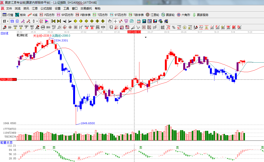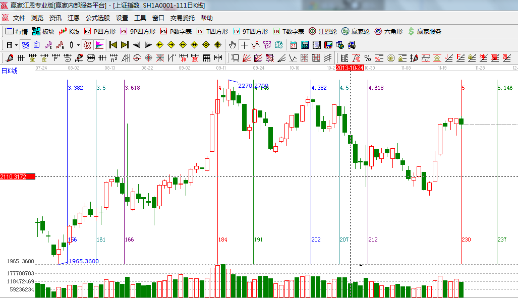 本周初18號滬指放量中陽突破江恩軟件極反通道生命線2170位置,隨后轉入橫盤震蕩格局,市場賺錢效應與活躍度增加成交量顯著放大,市場熱點圍繞改革題材炒作,如二胎開放、軍工、天津自貿區,特別是進入年底行情高送轉概念股也將成為持續的熱點,滬指趨勢不破極反通道生命線處于安全操作區投資者可繼續這類短期調整后的機會;技術方面從K線組合判斷中陽橫盤后遇到費氏時間將出現方向選擇,通常時間窗為陽線后的第3天、5天、8天,重點觀察市場下周初變化,波段思路看好未來行情,倉位上可保持在5成或5成以上,短線、波段結合操作;