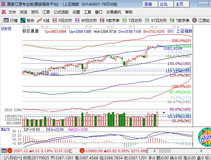 大盤上周五高開沖高回落震蕩收陽十字星,深成指和中小創漲幅在0.5%以上,大于滬指漲幅。板塊方面,煤炭、鋼鐵、有色板塊領漲,權重僅券商跑贏大盤,銀行、保險領跌;題材方面,科技股國產軟件、人工智能、網安和次新表現不錯,周期資源股、上海國改、金磚會議走勢較弱,個股漲多跌少成交量放量突破3100量。技術方面,滬指日線收盤略高于外軌線(3365點)2個點,短期15分鐘收在生命線,30、60分鐘逐級向生命線靠攏,江恩百分比270度是3320點,315度是3370點,預計滬指繼續圍繞外軌線上下震蕩,本周回補下方缺口的概率較大,因此操作上不追高,等待回撤后的機會,波段倉位控制在4成,短線倉2成,3350、3340為日內支撐,3374、3280為日內壓力。僅供參考,不構成任何投資建議。