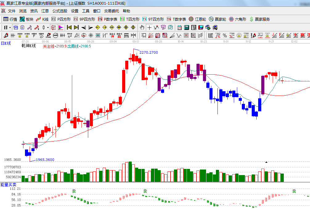 ★依據贏家江恩系統乾坤K線提示: 截止收盤破位藍色短期出局線,短期空,波段多;
