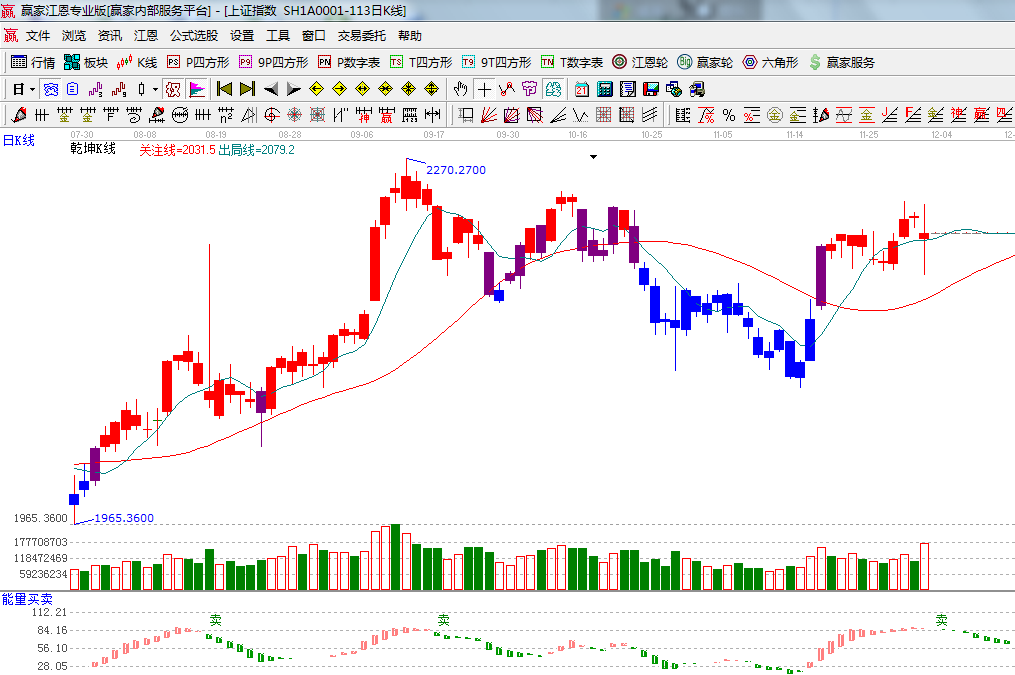 ☆依據贏家江恩系統能量買賣提示:多方量能紅色柱子縮短,出現賣出信號看空;