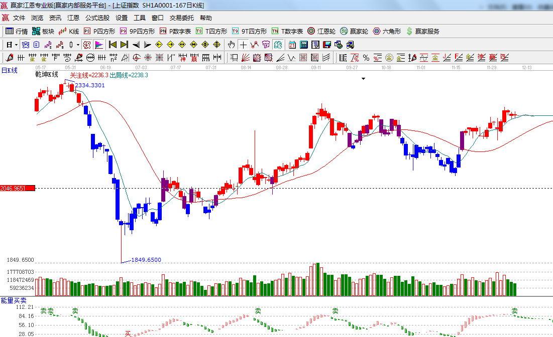 ★依據(jù)贏家江恩系統(tǒng)乾坤K線提示: K線回踩短期出局線,出局線運(yùn)行短線、波段看多,K線在出局線下運(yùn)行則是短線看空波段繼續(xù)看多;