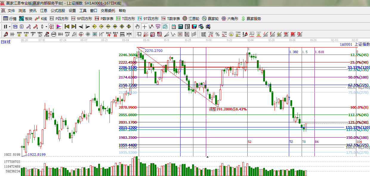 ★ 依據贏家江恩系統(tǒng)波段百分比提示:135度支撐位置觸底反彈,突破江恩120度線,上方江恩第一阻力關注90度2031點,第二阻力位45度2055點。
