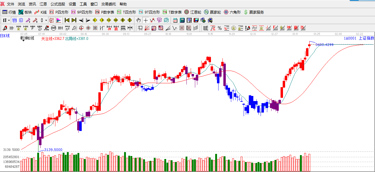 ★依據(jù)贏家江恩理論系統(tǒng)乾坤K線提示:滬指依舊處于紅色區(qū)域,短線出局線之上,依據(jù)規(guī)則,多頭。