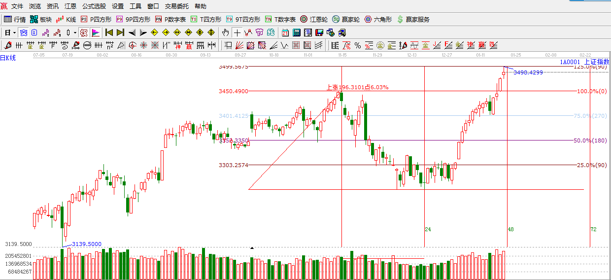 江恩看盤綜述:依據(jù)贏家江恩技術工具分析得出:本周在銀行、券商的推動下創(chuàng)反彈新高,盤中雖有波折 ,但整體趨勢依舊是向上的,滬指易漲難跌,但調(diào)整風險也隨時存在,對于銀行、地產(chǎn)雖然中線看好,但不宜追漲,逢調(diào)整低吸最佳。1月22日近期 提到的窗口,周五,滬指數(shù)次沖關3500點未果,預計短期3500點關口將有大的震蕩蓄勢,機會上,市場依舊是藍籌加次新股這兩大主線,可逢低關注 其中的績優(yōu)品種。