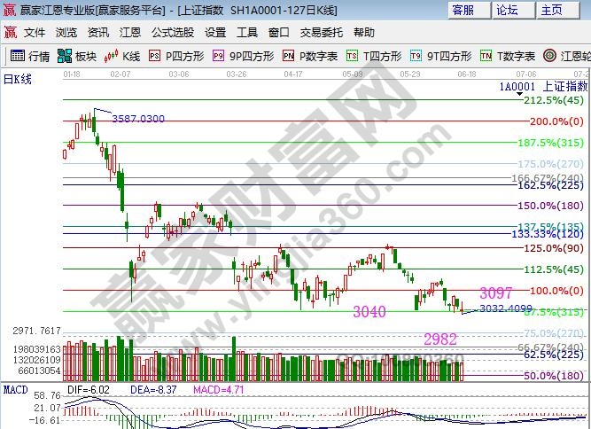 大盤破3040成為常態(tài)化,但所有收盤都在此點位上方,這也是多方操盤手使用贏家江恩系統(tǒng)百分比的緣故,明白失守一線看低一線原則,通過多次下破提前釋放恐慌情緒,遵守工具信號,百分比315度3040不破上看零度位置3097點,下破則是270度2982點。