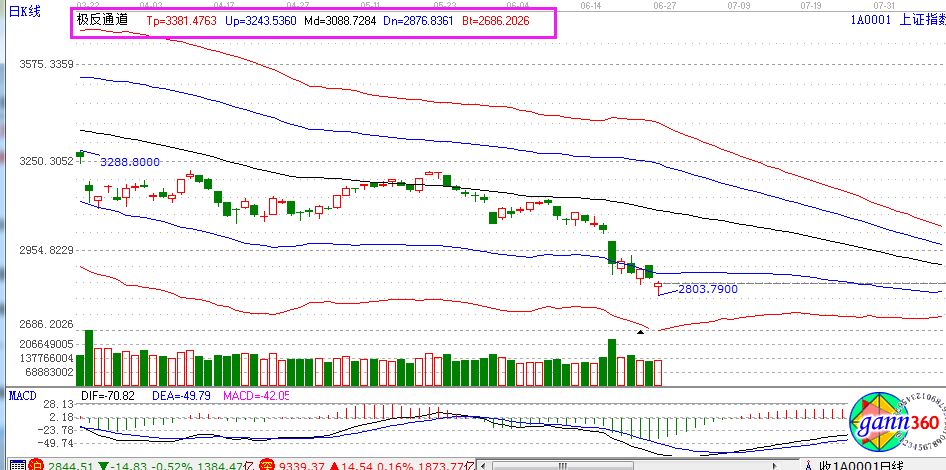 滬指跌0.52%,報收2844點;深成指漲0.16%,報收9339點;創(chuàng)業(yè)板漲1.71%,報收1564點。從盤面上看,數(shù)字中國、國產(chǎn)軟件、鈦白粉、網(wǎng)絡(luò)安全、工業(yè)互聯(lián)網(wǎng)、語音技術(shù)、芯片等板塊漲幅居前;機場航運、水泥、煤炭、銀行、房地產(chǎn)、租售同權(quán)等板塊跌幅居前。滬股通凈流入16億,深股通凈流入10億。相應的極反通道指標的支撐壓力提示,如下圖所示: