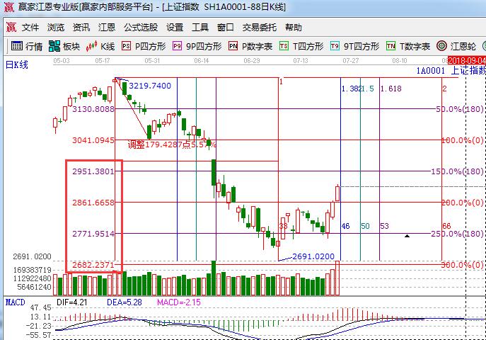 ★依據(jù)贏家江恩理論系統(tǒng)波段百分比延伸線(xiàn)提示:以5月21號(hào)高點(diǎn)為起點(diǎn),5月30號(hào)低點(diǎn)為終點(diǎn)做百分比延伸線(xiàn)如下圖,180度、零度對(duì)應(yīng)的是2771點(diǎn)、2861點(diǎn),2861零度位置不破,短線(xiàn)還有望向上2951靠近。