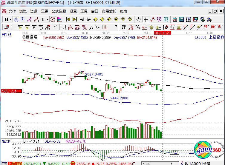 滬指跌0.04%,報收2574點;深成指漲0.25%,報收7635點;創業板漲0.83%,報收1315點。盤面上看,通信設備、5G、網絡安全、獨角獸概念、手游、網絡游戲等板塊漲幅居前;福建自貿區、機場航運、高送轉、銀行、物流、石油等板塊跌幅居前。滬股通凈流入3.6億,深股通凈流入5300萬。相應的極反通道指標的支撐壓力提示,如下圖所示: