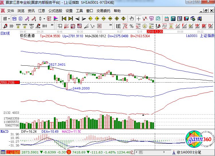 滬指跌1.05%,報收2549點;深成指跌1.48%,報收7418點;創(chuàng)業(yè)板跌1.90%,報收1268點。盤面上看,豬肉、石油、醫(yī)療器械、自由貿(mào)易港、醫(yī)藥電商等板塊跌幅居前。滬股通凈流出6900萬,深股通凈流出4億。相應(yīng)的極反通道指標的支撐壓力提示,如下圖所示: