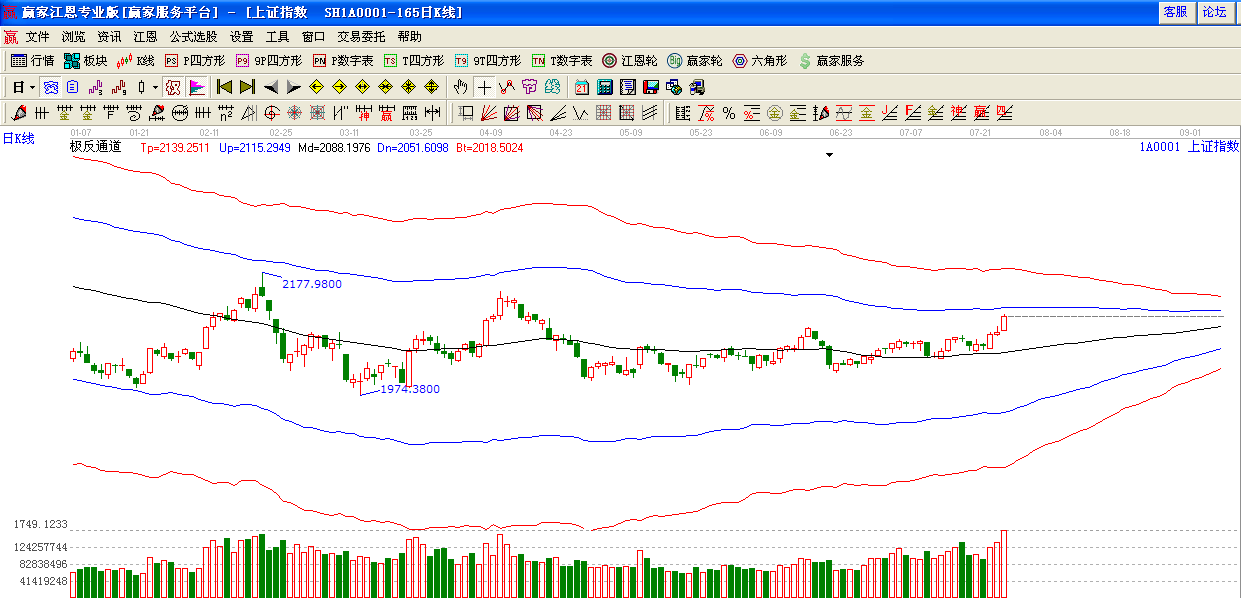 ★依據(jù)贏家江恩系統(tǒng)極反通道提示:在權(quán)重的帶動下,攻擊藍(lán)色外軌線,外軌線阻力2120點(diǎn)。