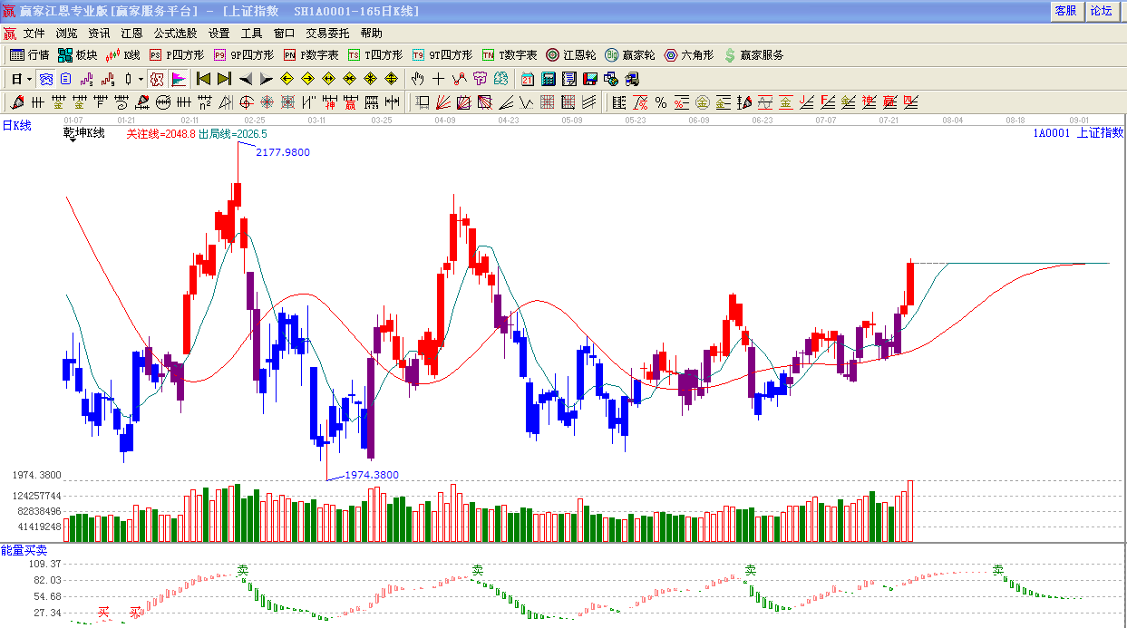 ★依據(jù)贏家江恩系統(tǒng)能量買賣提示:紅色能量柱加上,但可以看出較前期能量柱有背離跡象。