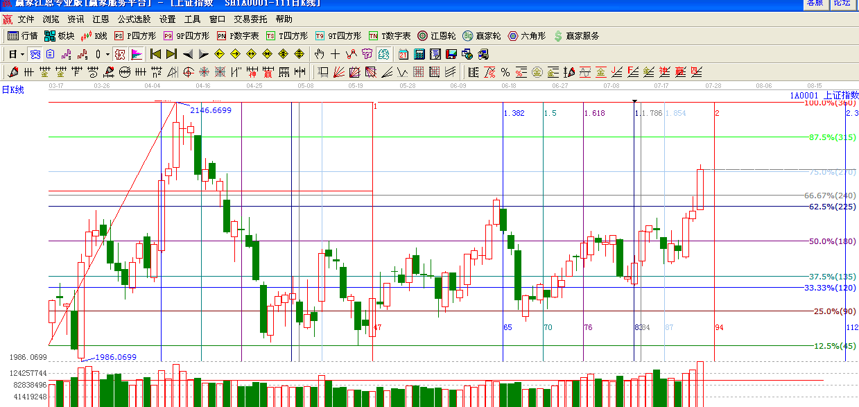 江恩看盤綜述:依據(jù)贏家江恩技術(shù)工具分析得出:在權(quán)重的帶動下,放量突破年線,站上2100點(diǎn),目前接近極反通道藍(lán)色外軌線阻力區(qū),預(yù)計(jì)周五高位震蕩為主。日線下一時間窗口是7月28日,操作上,關(guān)注低位藍(lán)籌股以及受益微刺激的高鐵、核電、特高壓等概念。