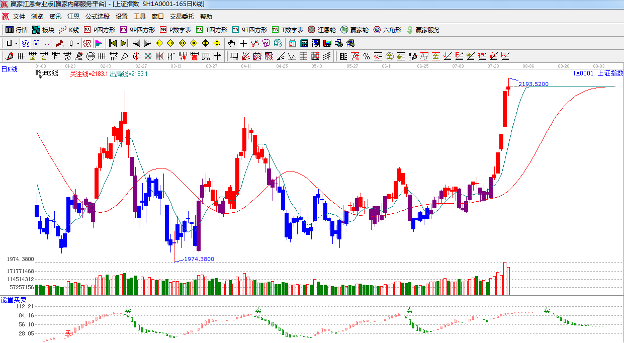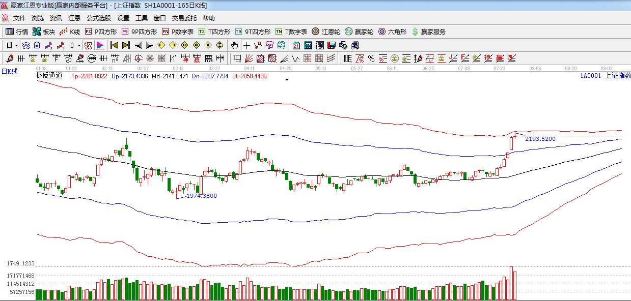 盤面上,個(gè)股板塊漲多跌少,航天軍工,國(guó)產(chǎn)軟件,鋰電池,倉(cāng)儲(chǔ)物流等板塊表現(xiàn)活躍,藍(lán)籌股出現(xiàn)分化,鋼鐵、有色、煤炭等出現(xiàn)不同程度的回調(diào),只有房地產(chǎn)和券商板塊上漲,今日題材股表現(xiàn)好于權(quán)重股,指數(shù)上攻動(dòng)能在衰減,而且指數(shù)也逼近極反通道紅色外軌阻力線附近,預(yù)計(jì)短期大盤將沖高回落。