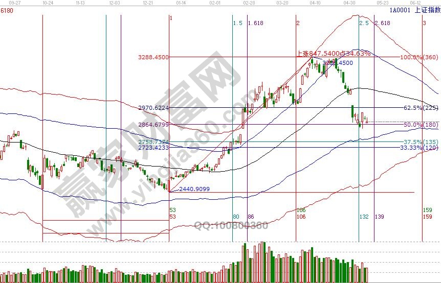大盤延續(xù)極反通道生命線下弱勢(shì)通道運(yùn)行,按贏家江恩十六字投資真言,時(shí)價(jià)共振短線反彈信號(hào)依然存在,隨著江恩時(shí)間窗口臨近,短線又將再度選擇方向,前期的快速下跌,市場(chǎng)需要時(shí)間積累能量化解短線壓力,按工具信號(hào)開倉(cāng)的籌碼,要有足夠的耐心和充分的風(fēng)險(xiǎn)控制能力,應(yīng)對(duì)策略可查看14號(hào)大勢(shì)分析。15號(hào)盤中支撐壓力是180度2928點(diǎn)、315度2944點(diǎn),盤中支撐0度2860點(diǎn),本周五17號(hào)是5月第二個(gè)時(shí)間窗口。操作策略,指數(shù)擊破黑色生命線,藍(lán)色下軌線是回撤目標(biāo)位,高風(fēng)險(xiǎn)者倉(cāng)位3-4成,低風(fēng)險(xiǎn)者等待中期參考位。