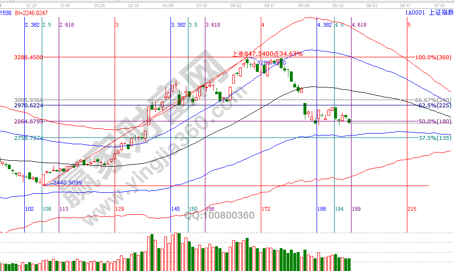 時間是決定市場走勢最重要因素。回顧贏家江恩系統(tǒng)工具點評時間窗口,4月22號指出降低倉位至3成,4月25號提示低風(fēng)險者空倉休息,5月9號時間窗口提示短線高風(fēng)險可以開倉,17號時間窗口前(15、16號)提示獲利出局,這兩天提示短線周期時間窗口(23號)將確認(rèn)一關(guān)鍵位,從收盤數(shù)據(jù)看,市場明日失守波段百分比180度2834點,價格拐點將是5月第三個日線時間窗口28、29號,在此時間段,無技術(shù)、無紀(jì)律者休息不要再被收割了,你是否將1季度的收益已回吐市場?要改變虧損的現(xiàn)狀,從擁有一套完整交易體系開始。江恩理論研究時空運行,通過工具預(yù)判出時間后,空間上則看趨勢工具極反通道藍(lán)色下軌線(VIP學(xué)員查看相應(yīng)位置)。日線藍(lán)色下軌線站穩(wěn)將是又一次操作機(jī)會,待整固結(jié)束后市場必會有一波反彈到生命線行情,而這機(jī)會是留給有準(zhǔn)備的交易者。24號盤中壓力是315度2844點、0度2860點,盤中支撐是225度2815、180度2800點。操作策略,指數(shù)擊破黑色生命線進(jìn)入弱勢區(qū)域,高風(fēng)險者倉3-4成,低風(fēng)險者本周進(jìn)入備戰(zhàn)期。