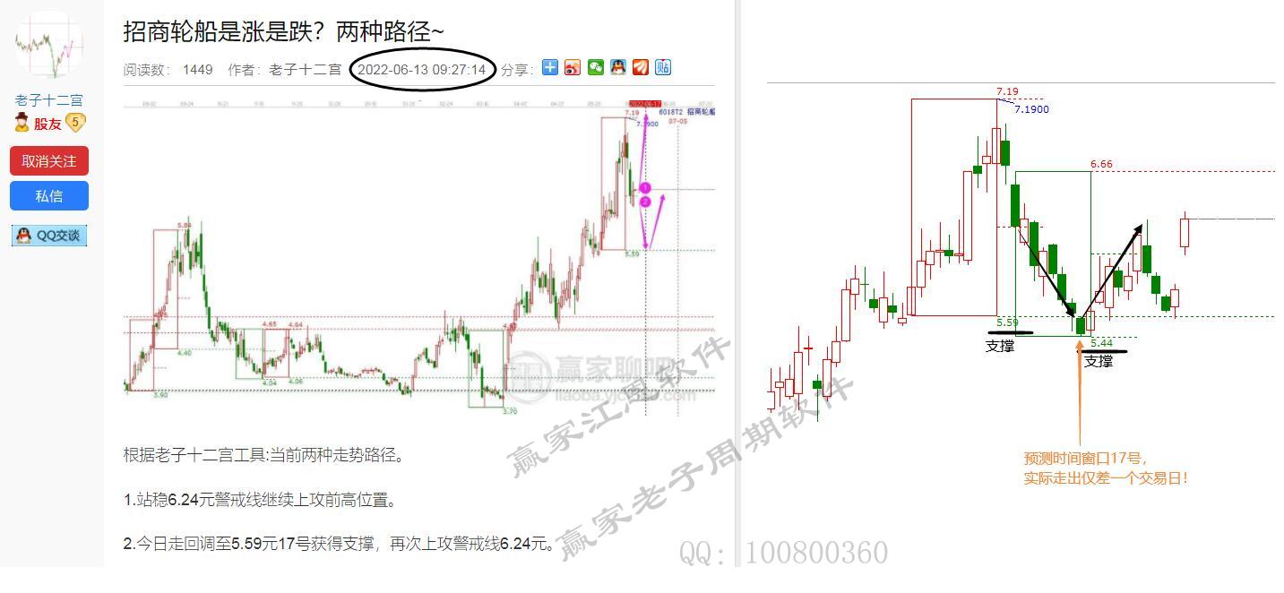 招商輪船6月13號依據十二宮時空工具預測未來趨勢,預判未來時間窗口17號變盤,價格趨勢給出兩種路徑,第一種直接獲得警戒線支撐上漲頂部7.19元目標位。第二種跌破警戒線回調結構底部5.59元位置到17號再次上攻警戒線6.24元位置。