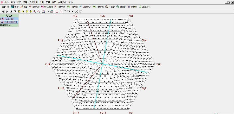 學習江恩理論的朋友,大部分都了解,江恩會運用大量的多邊形來繼續擰市場的時間和價格的分析,例如江恩正方形,江恩輪中輪等等。江恩六角形其實是贏家江恩軟件中的一個工具,具體的圖形如下圖。