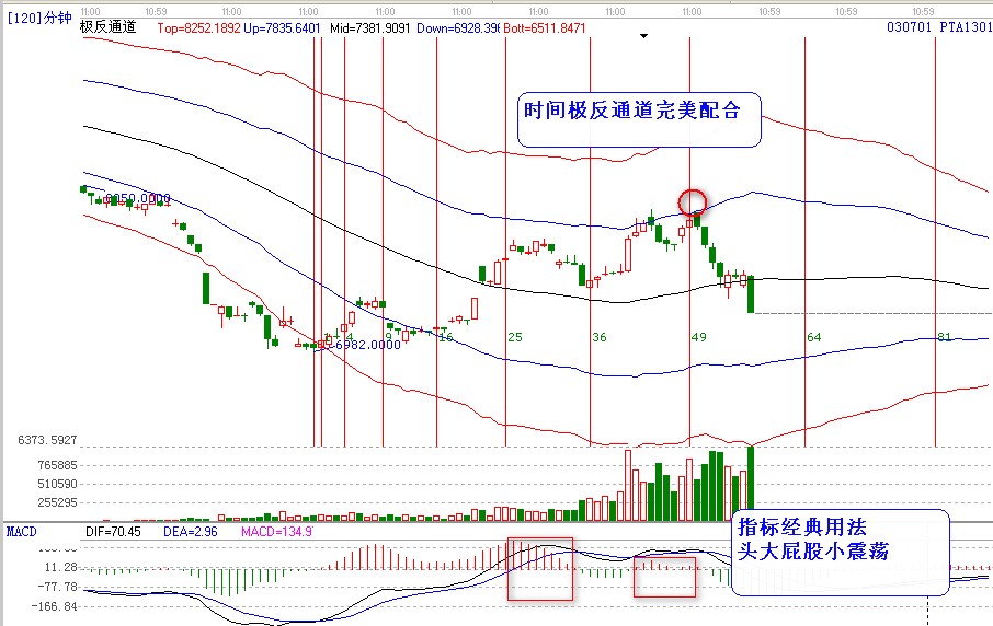 極反通道價格趨勢共振,時間共振49,指標背離共振。然后開始瘋狂的下跌。短期看極反通道下軌位置64時間