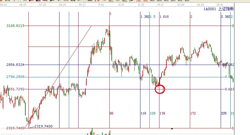 2319.74點(diǎn)到3186.72點(diǎn)運(yùn)行了86個交易日上漲了866.98點(diǎn)。這一波的回撤跌倒黃金價格的0.618位置附近時間也剛好是黃金分割時間的1.618位置如圖所示:
